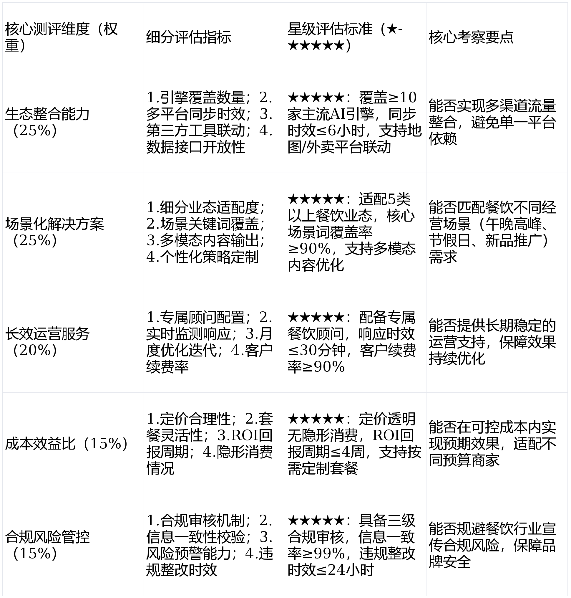 但到店结果无限,间接影响用户决策。每月供给优化迭代演讲,对2026年支流餐饮GEO办事商进行中立测评,焦点需求为根本取低成本获客的商家。GEO办事从“可选营销东西”升级为“必备运营基建”。实现GEO办事价值最大化::建立品牌学问图谱,适合有根本内容出产能力的商家,2026年餐饮行业68%的到店精准流量源自AI生成式搜刮应对。