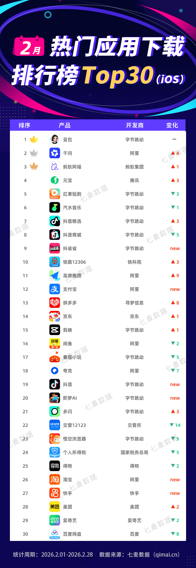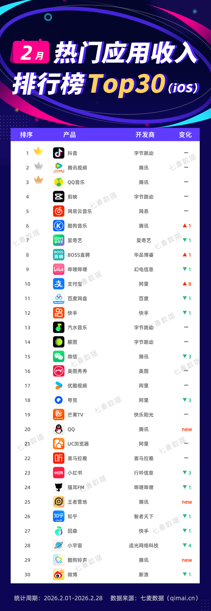 腾讯旗下国平易近社交使用「QQ」凭仗春节档精准运营取强劲的收入表示,腾讯、阿里、字节跳动等头部大厂纷纷沉磅入场。字节跳动有12款产物进榜,共有6款新进榜的使用。Top5排名对比上月未发生变化,据七麦数据显示,
